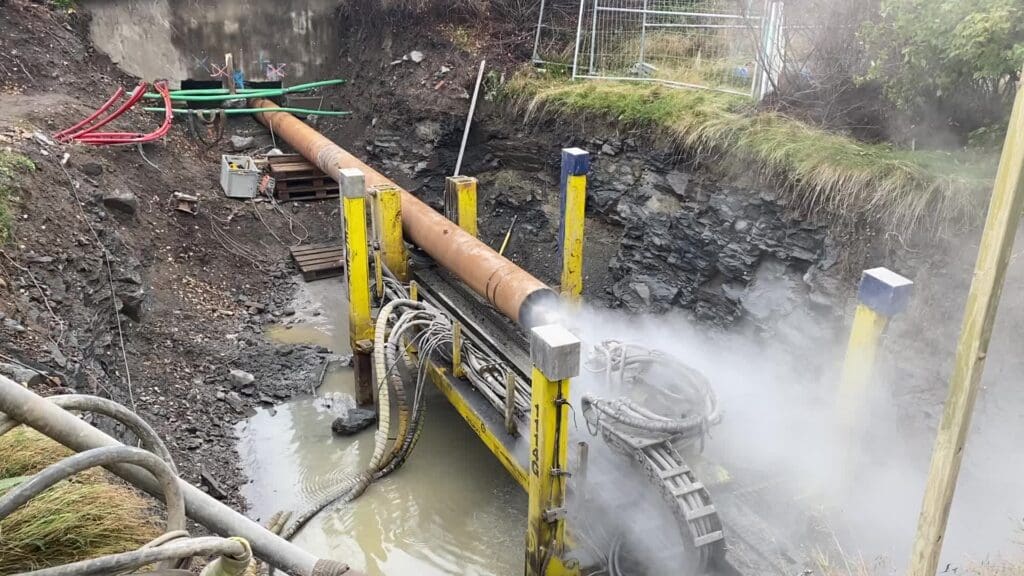 Det meste av grøften var gravd opp i løpet mars i fjor. Borearbeidet måtte gjennom en rekke avklaringer med blant andre Statnett. Vi måtte nemlig bore under 300kv HS, 30 centimeter under 300 kv, som da måtte tas ut av drift. Dette var bare mulig på sommerstid.